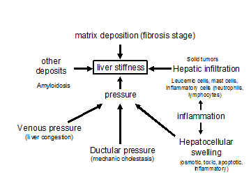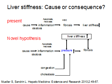 Together with L. Sandrin, we have developed the novel pressure-stiffness-matrix hypothesis to explain liver cirrhosis (presented in ref. 41). Fig. 3 below schematically shows the principle. We believe that all liver disease whether it is inflammation, congestion, cholestasis etc. lead to increased sinusoidal pressure either by cellular volume increase, osmotic or hydrostatic pressure. This pressure increases shear forces on stellate cells their actual signal for collagen depostion. We postulate further that the secreted matrix corresponds to the pressure in terms of time and intensity. Liver stiffness is ultimately the results of increased pressure or/and matrix deposition.