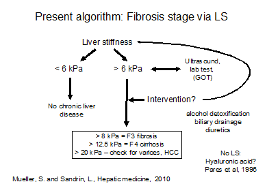 c) that intervention (e.g. alcohol detoxification, treatment of congestive heart failure with diuretics etc.) will lower the liver stiffness which then even better reflects the true fibrosis stage. Our actual practiced algorithm is shown below.